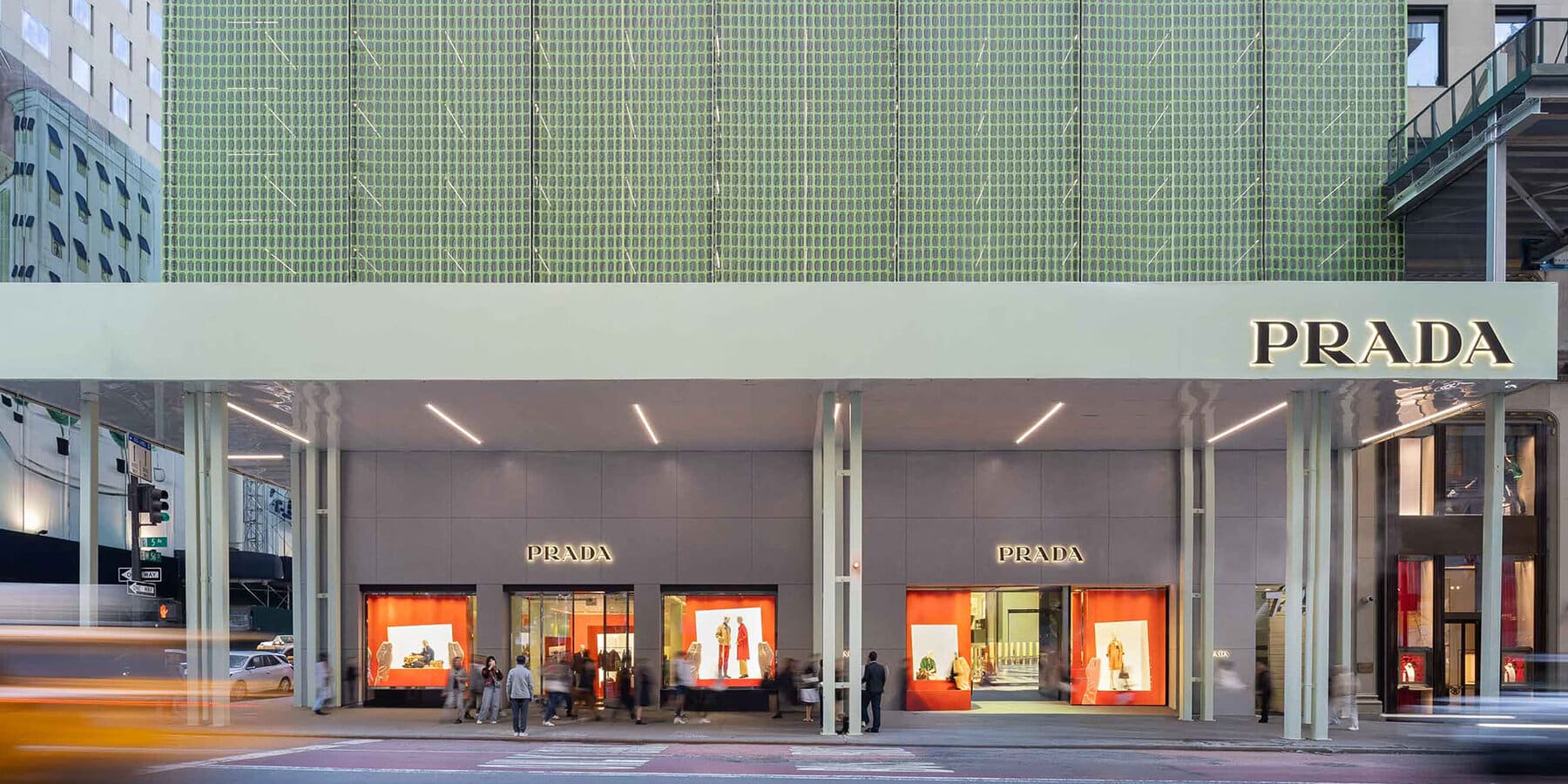 Shimmering moiré facade of prada flagship in NYC rethinks the permanence of scaffolding